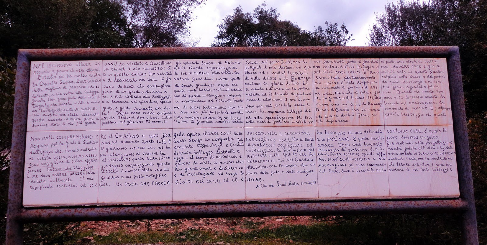 "Nel 1955 (avevo allora 25 anni) ho visitato a Barcellona gli splendidi lavori di Antonio Gaudì. Nel Parco Guell, con le sue panchine fatte di frantumi di piatti, dove alberi di pietra stavano a fianco di veri alberi. Ho trovato il mio maestro: Gaudì. Questa esperienza ha forgiato il mio destino: un giorno costruirò un rifugio dove trovare pace e gioia. L'Italia mi ha molto aiutata in questo cammino. Ho visitato le sue numerose città d'arte, le chiese ed i vari tesori artistici così unici e reperibili solo in questo paese: la Cappella Sistina, l'ultima cena di Leonardo da Vinci. I favolosi giardini come quello di Villa d'Este e di Bomarzo. Sono stata particolarmente colpita dalle chiese e dal pensiero delle migliaia di persone che si sono dedicate alla costruzione di questi grandiosi edifici che cantano la gloria di Dio. La mia visione è stata rinforzata da queste esperienze e mi sono dedicata a mia volta alla realizzazione di un giardino che ispiri, a questo mondo turbato, sentimenti artistici di serenità e di amore per la natura. Ho cominciato il giardino nel 1979 tra grandi difficoltà e fatiche fisiche. Una grande parte della mia vita è stata dedicata alla realizzazione di questa costruzione malgrado malattie ed isolamento di familiari ed amici. Ma niente mi poteva fermare. Quando mio marito Jean Tinguely era ancora in vita e veniva a lavorare nel giardino, spesso ci incontravamo ad Orvieto perché entrambi adoravamo il suo Duomo. Ma un giorno nel lontano 1985, dopo aver visto lo scempio causato da un sovraffollamento di autobus, gente e guide vocianti, decidemmo di non ritornarci mai più. Non era più possibile usare la chiesa come un luogo di raccoglimento ed ammirazione: la sua santità era stata dissacrata! Troppe cose erano cambiate. Non era più possibile condividere la suprema bellezza del Duomo d'Orvieto con un numero esagerato di persone. E putroppo questo accade in molti posti artistici italiani dove i beni culturali vengono asserviti al lucro ed alla speculazione. Mi ricordo di avere detto a Jean, con grande tristezza che questo satrebbe stato il mio più grande problema col giardino. Mi promisi che mai il giardino sarebbe caduto nelle mani di gente che avrebbe potuto degradarlo. Non molti comprendono che il Giardino è una fragile opera d'arte con i suoi specchi, vetri e ceramiche, ha bisogno di una delicata continua cura . E' questa la ragione per la quale il Giardino non può rimanere aperto tutto l'anno senza un'adeguata manutenzione cadrebbe in rovina in pochi anni. E questa manutenzione dev'essere eseguita dall'equipe che, avendo costruito il giardino insieme con me ha acquisito l'esperienza e l'abilità di farlo con cognizione ed amore. Dopo aver lavorato per vent'anni alla progettazione di questa opera , non ho nessuna intenzione di vedere la delicata bellezza distrutta e vandalizzata. La mia visione del messaggio del giardino è, e rimarrà fedele all'idea originale. Sono orgogliosa di poter offrire al visitatore questa rara ricchezza e il tempo di assimilare e riflettere sullo spirito del Giardino, senza essere spinti affannosamente intorno come un branco di pecore. Coloro che traggono guadagno organizzando questo genere di visite in massa non entreranno mai nel Giardino. Noi non continueremo a dissacrare l'arte ma la mostreremo come deve essere presentata. L'Italia è sempre stata uno dei miei grandi amori e desidero contribuire, con l'esempio, alla conservazione dei suoi innumerevoli tesori artistici e della sua eredità culturale. Il mio giardino è un posto metafisico e di meditazione. Un luogo lontano dalla folla e dall'incalzare del tempo, dove è possibile assaporare le sue tante bellezze e significati esoterici delle sculture. UN POSTO CHE FACCIA GIOIRE GLI OCCHI ed il CUORE.